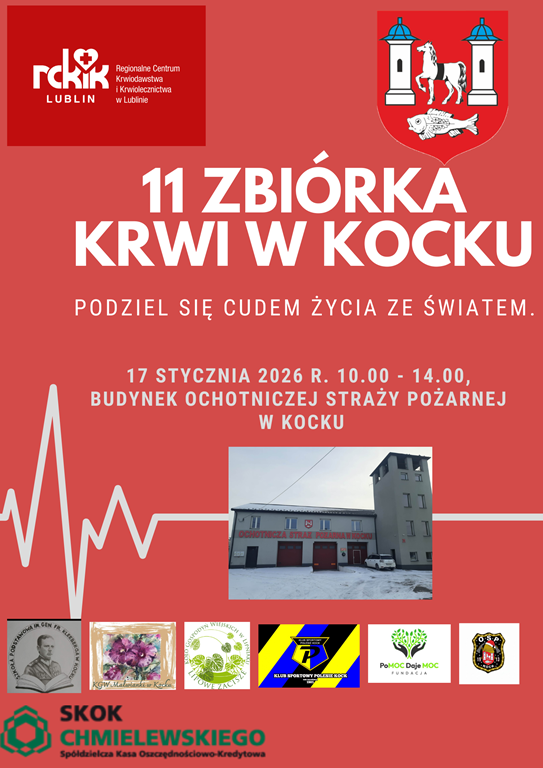 Czytaj artykuł (lektor) Drukuj stronę Wyświetl stronę w formacie PDF 17 stycznia 2026 zbiórka krwi w Kocku 7 stycznia 2026 Zapraszamy do oddawania krwipodczas11zbiórki krwi w budynku Ochotniczej Straży Pożarnej w Kocku w dniu 17 stycznia 2026r.