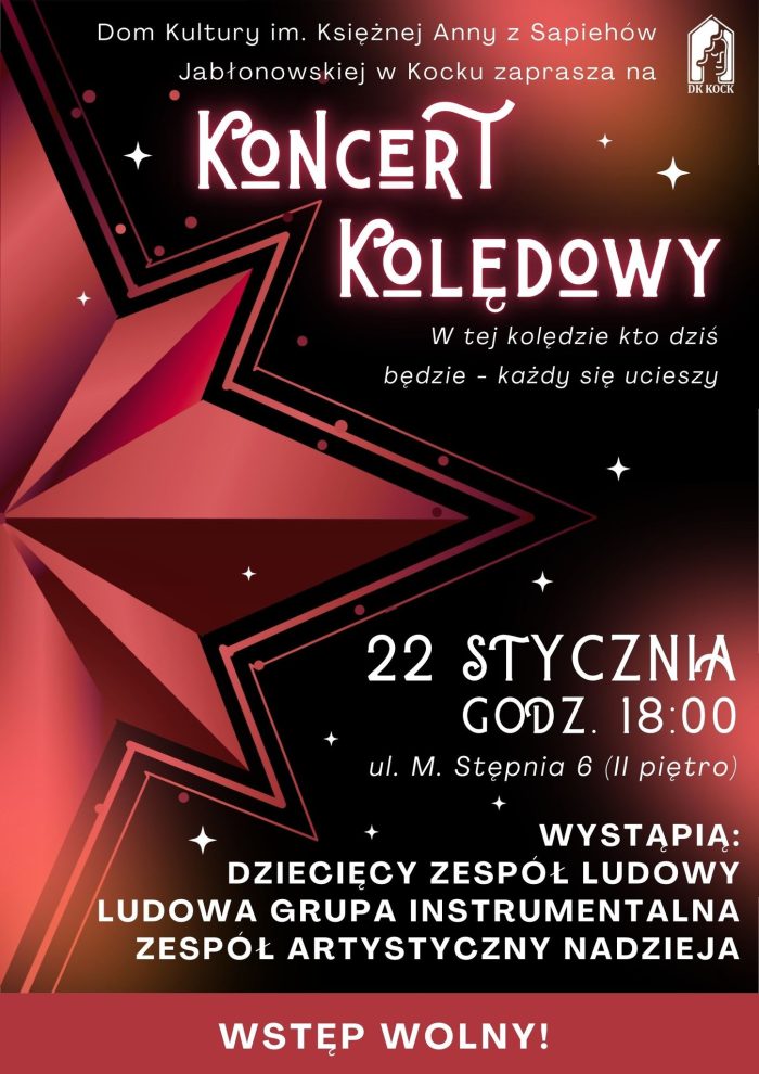 Dom Kultury w Kocku zaprasza w najbliższy czwartek 22 I o godz. 18.00 na koncert kolędowy „W tej kolędzie kto dziś będzie – każdy się ucieszy!” Wystąpi Dziecięcy Zespół Ludowy wraz z ludową grupą instrumentalną oraz Zespół Artystyczny „NADZIEJA”.