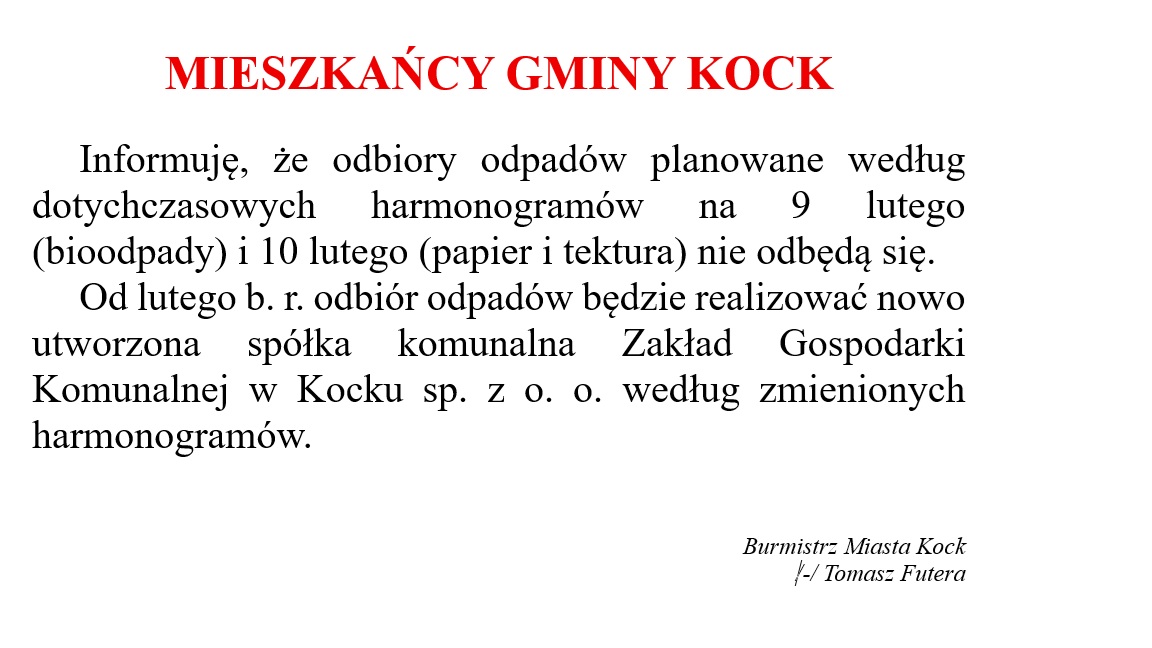 Czytaj artykuł (lektor) Drukuj stronę Wyświetl stronę w formacie PDF MIESZKAŃCY GMINY KOCK 6 lutego 2026 Zmiana harmonogramu odbioru odpadów