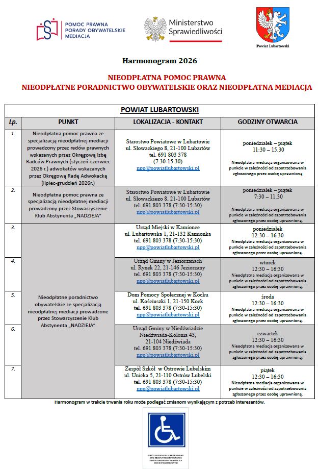 Starostwo Powiatowe w Lubartowie informuje o funkcjonowaniu punktów nieodpłatnej pomocy prawnej ze specjalizacją nieodpłatnej mediacji oraz nieodpłatnego poradnictwa obywatelskiego ze specjalizacją nieodpłatnej mediacji w 2026 r. zawierającej przekierowanie do strony Powiatu Lubartowskiego – Nieodpłatna Pomoc Prawna, Nieodpłatne Poradnictwo Obywatelskie oraz Nieodpłatna Mediacja: https://www.powiatlubartowski.pl/urzad/nieodplatna-pomoc-prawna. (specjalnie dedykowany kafelek na stronie głównej). W załączeniu harmonogram funkcjonowania punktów oraz lista jednostek nieodpłatnego poradnictwa. Dodatkowo ww. informację, harmonogram oraz listę prosimy umieścić na tablicy ogłoszeń i w miejscach zwyczajowo przyjętych.