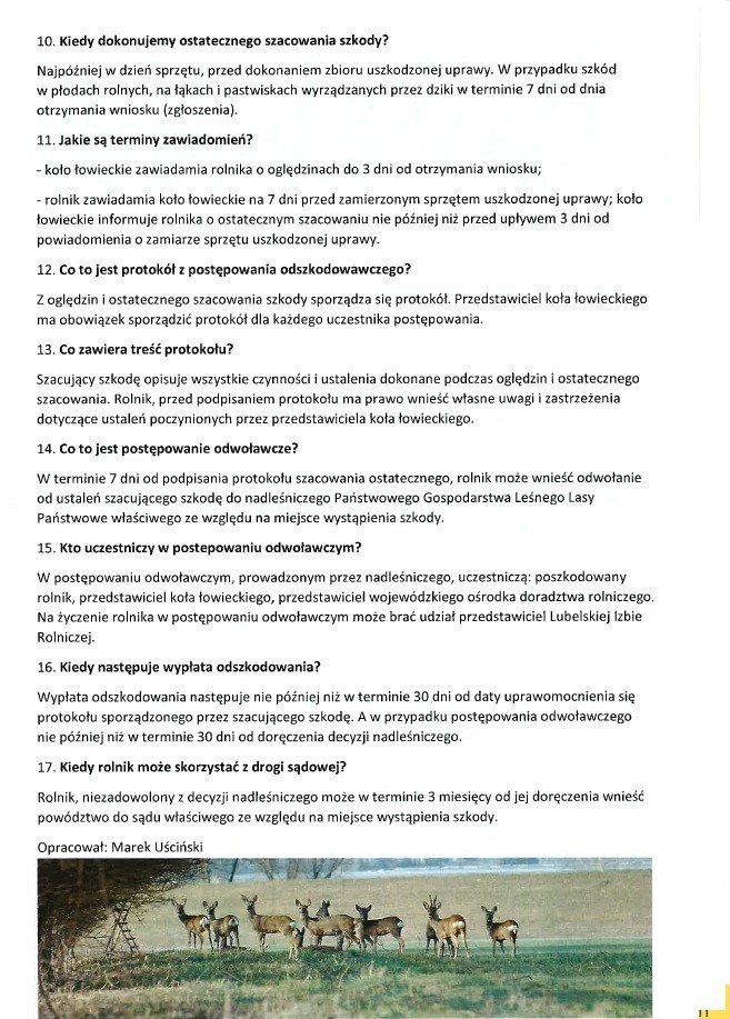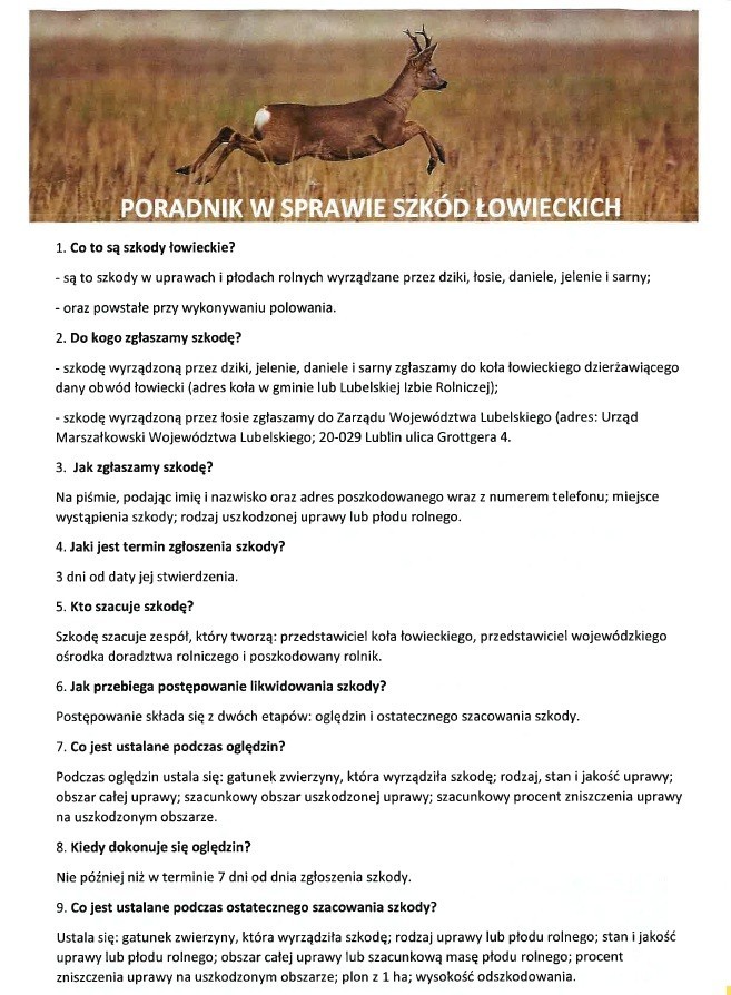 Czytaj artykuł (lektor) Drukuj stronę Wyświetl stronę w formacie PDF Poradnik w sprawie szkód łowieckich 24 kwietnia 2026 Co to są szkody łowieckie, do kogo zgłaszamy szkody i jak zgłaszamy szkody łowieckie oraz wiele innych informacji.