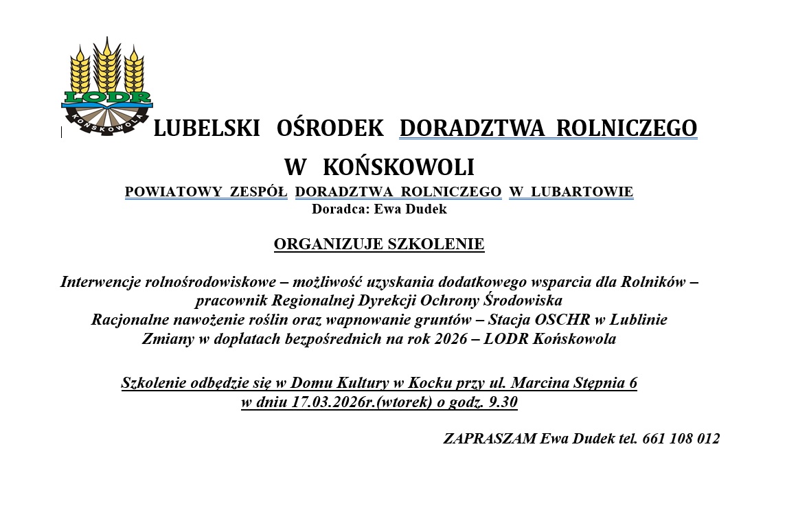 Czytaj artykuł (lektor) Drukuj stronę Wyświetl stronę w formacie PDF Szkolenia dla rolników 10 marca 2026 LODR w Końskowoli organizuje szkolenia
