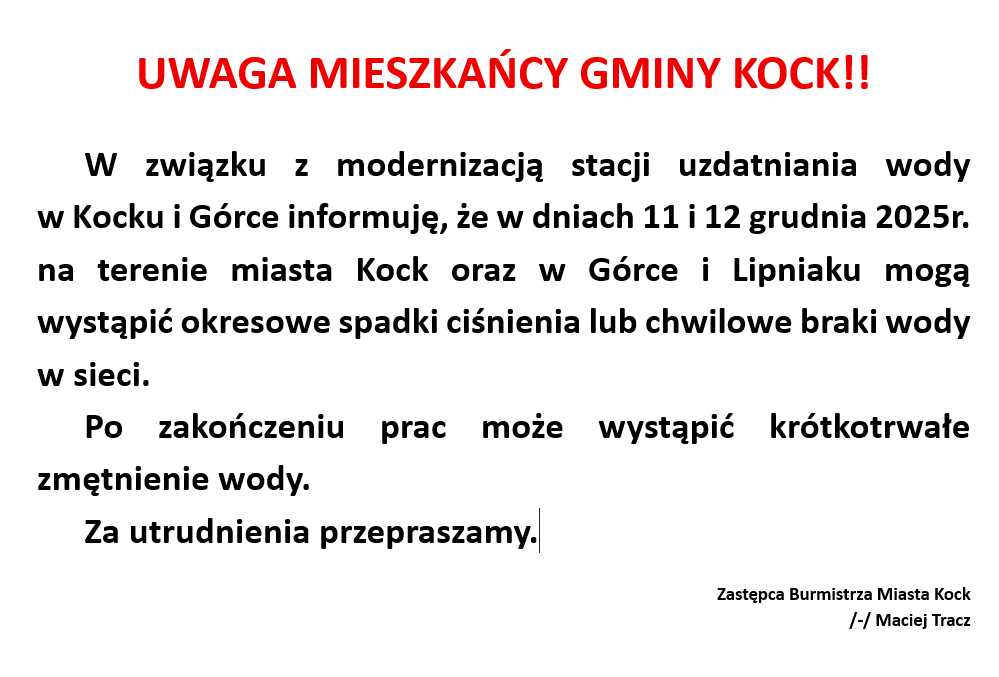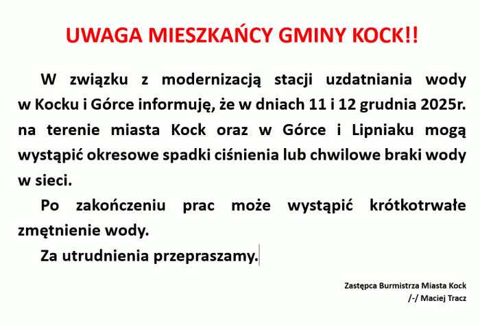 Czytaj artykuł (lektor) Drukuj stronę Wyświetl stronę w formacie PDF Uwaga mieszkańcy Gminy Kock!! 10 grudnia 2025 Możliwe przerwy w dostawie wody.