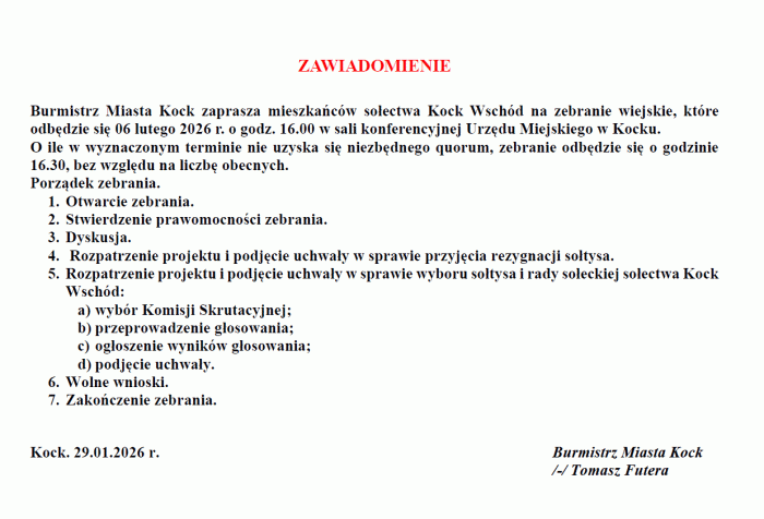 Czytaj artykuł (lektor) Drukuj stronę Wyświetl stronę w formacie PDF Zebranie sołeckie mieszkańców sołectwa Kock Wschód 29 stycznia 2026 UWAGA! Mieszkańcy sołectwa Kock Wschód